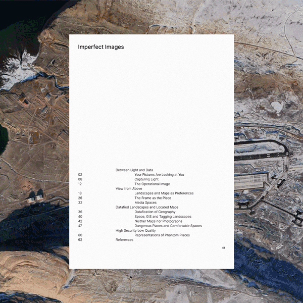 Imagens Imperfeitas investiga os processos invisíveis da cartografia digital, centrando-se na fragmentação e estratificação das imagens operativas utilizadas na representação espacial de localizações na plataforma Google Earth. Através da análise de coordenadas associadas a infraestruturas invisíveis, o projeto explora a simbiose entre o experienciável e o oculto. A partir da recolha e manipulação de imagens digitais de locais com infraestruturas invisíveis de poder, foi desenvolvido um website para a construção de um espaço explorável. Uma publicação impressa complementa este objeto com uma seleção de textos relativos à temática do projeto, aprofundando os conceitos teóricos e os aspetos técnicos que sustentam a investigação.